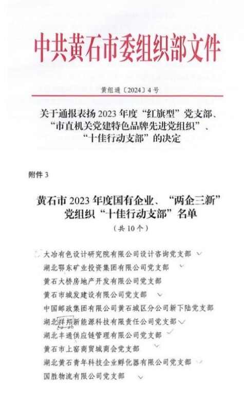 【喜報(bào)】喜訊!城發(fā)建工集團(tuán)城發(fā)建設(shè)公司黨支部獲評2023年度黃石市國有企業(yè) “十佳行動支部”