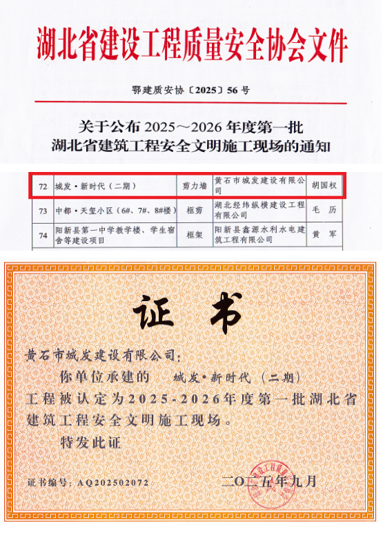 近日,黃石市城發(fā)建設有限公司承建的城發(fā)·新時代(二期)項目喜獲殊榮,被認定為2024至2025年度第三批湖北省建筑結(jié)構(gòu)優(yōu)質(zhì)工程和2025-2026年度第一批湖北省建筑工程安全文明施工現(xiàn)場。這一成就不僅彰顯了項目部的卓越管理能力,更標志著城發(fā)建工集團在打造高品質(zhì)人居標桿的道路上邁出了堅實一步。
