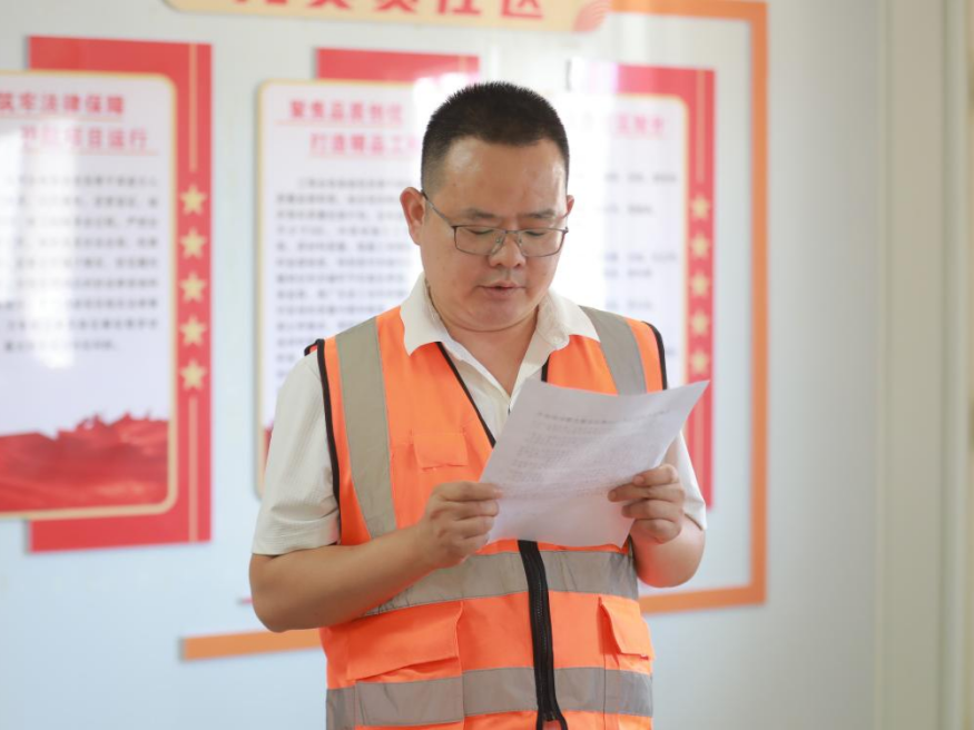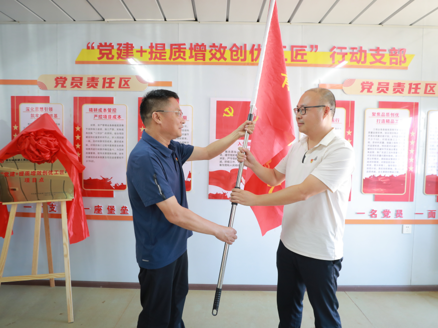 隨后,建工集團機關(guān)黨支部開展“能工巧匠”黨建品牌活動,學(xué)習(xí)宣貫了清廉項目清風(fēng)工匠行動、青年突擊攻堅工匠行動和提質(zhì)增效創(chuàng)優(yōu)工匠行動實施方案。王鵬同志帶領(lǐng)全體黨員宣讀了廉潔從業(yè)誓詞,崔巍同志和呂成芳同志分別為項目廉潔監(jiān)督員頒發(fā)聘書,廉潔監(jiān)督員代表作了履職承諾。建工集團機關(guān)支部舉行了“建工集團青年先鋒突擊隊”授旗儀式,洪登峰同志將隊旗授予青年先鋒突擊隊隊長。最后全體黨員按照黨員責(zé)任區(qū)分工檢查了項目安全、進度、質(zhì)量、經(jīng)營、物資管理、法律風(fēng)險的情況,并與項目部深入交流,提出改進措施和意見。